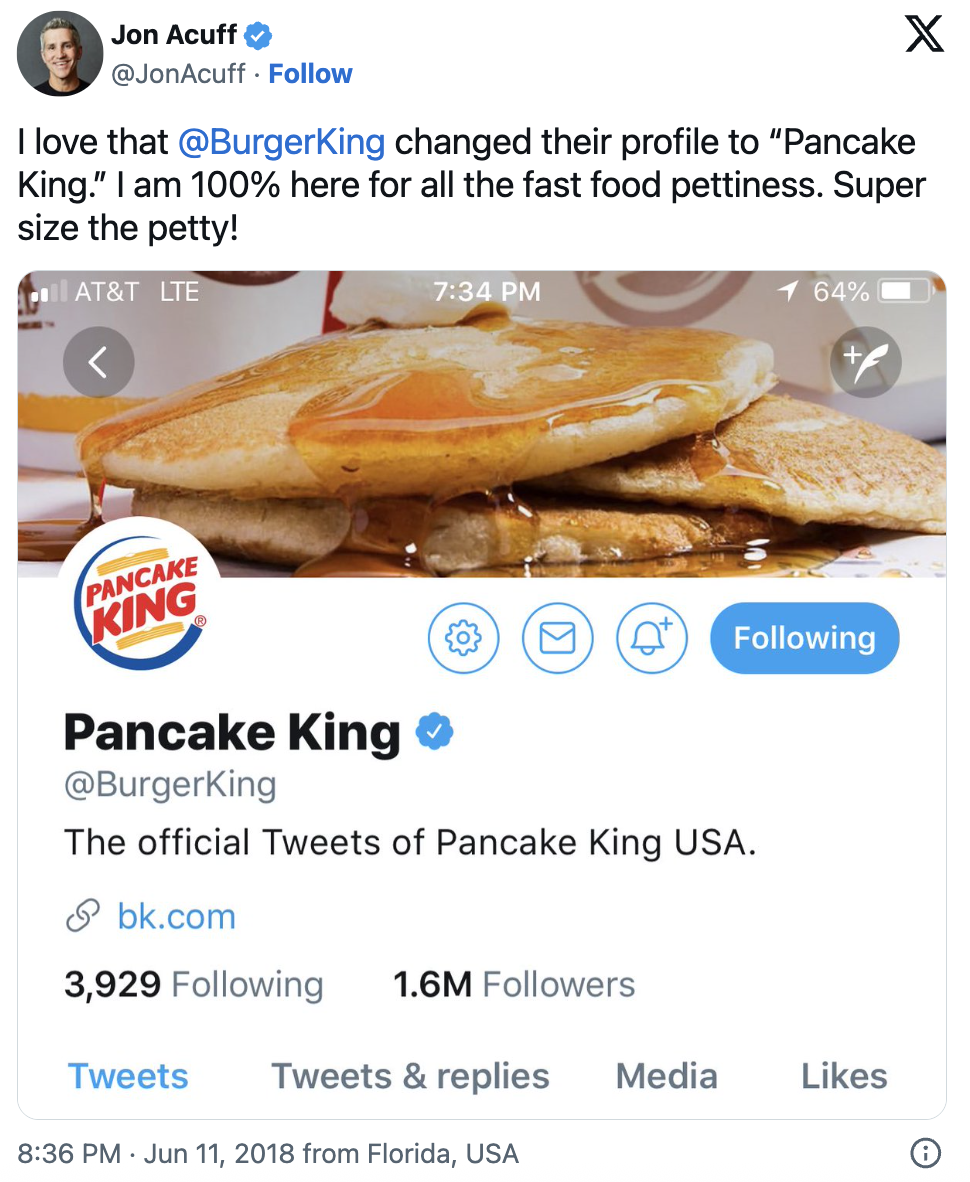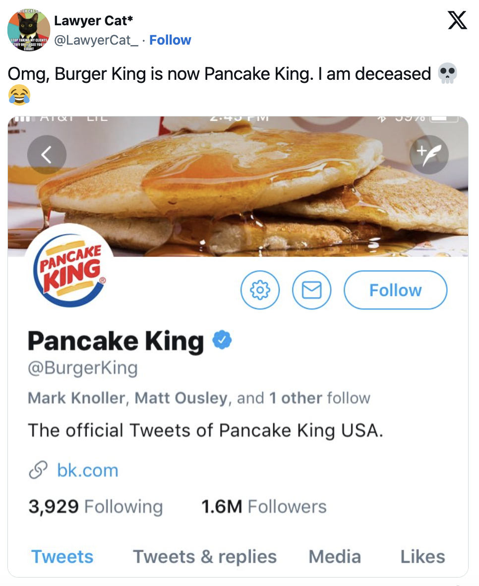 IHOP got a little too excited when they decided to change their name to "IHOB" (International House of Burgers). Since we’re the King of Burgers, we don’t take brands treading on our territory lightly. That’s why we decided to co-opt the IHOB momentum on social by changing Burger King’s name, logo, profile pictures, and cover photos across all of our social platforms to "Pancake King" without saying a word or leveraging PR.