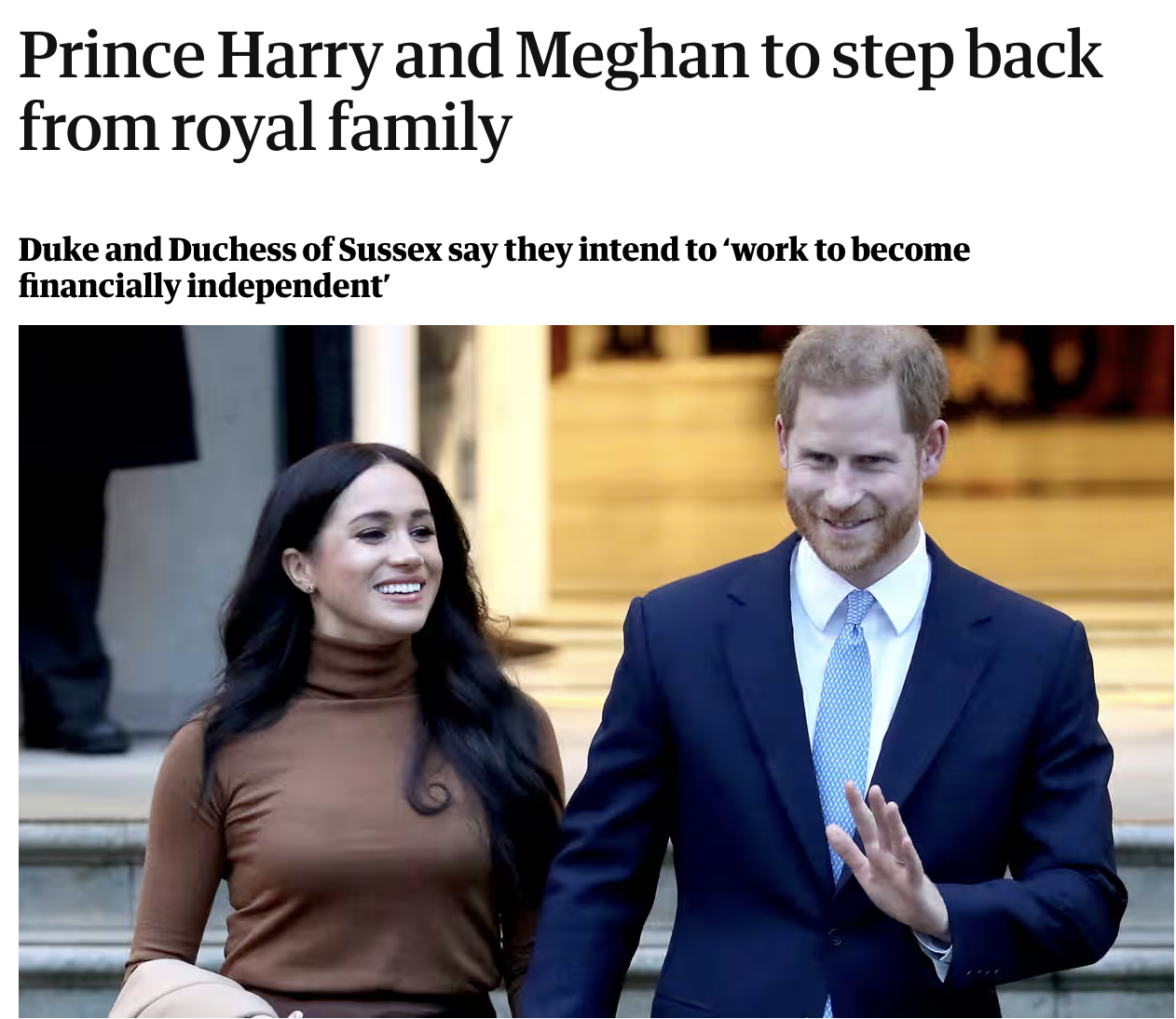 In the wake of Megxit, January 2020 , the Duke and Duchess announced plans to "step back" as members of the Royal Family and work towards financial independence.