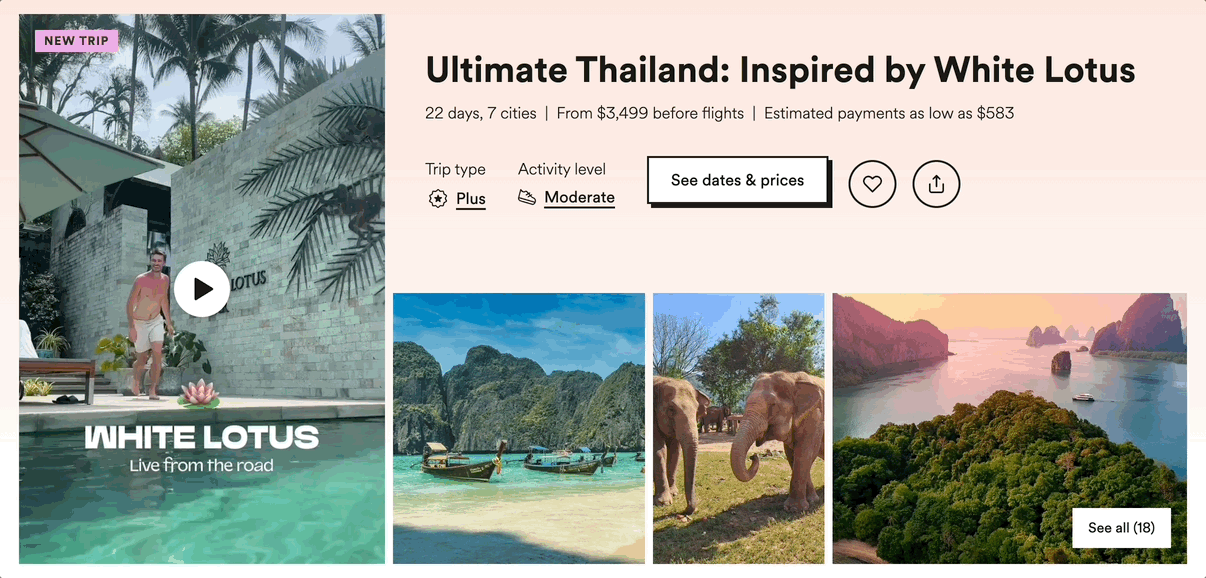 Not only did we drop the trip right as The White Lotus season 3 premiered, but we sent a team to Thailand to create immersive content inspired by each episode. And, after every new episode, we updated the itinerary to include the featured destinations and experiences.